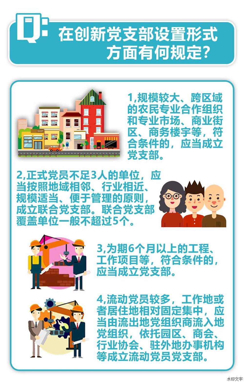 第四條 黨支部設置一般以單位、區(qū)域為主,以單獨組建為主要方式。企業(yè)、農村、機關、學校、科研院所、社區(qū)、社會組織、人民解放軍和武警部隊連(中)隊以及其他基層單位,凡是有正式黨員3人以上的,都應當成立黨支部。