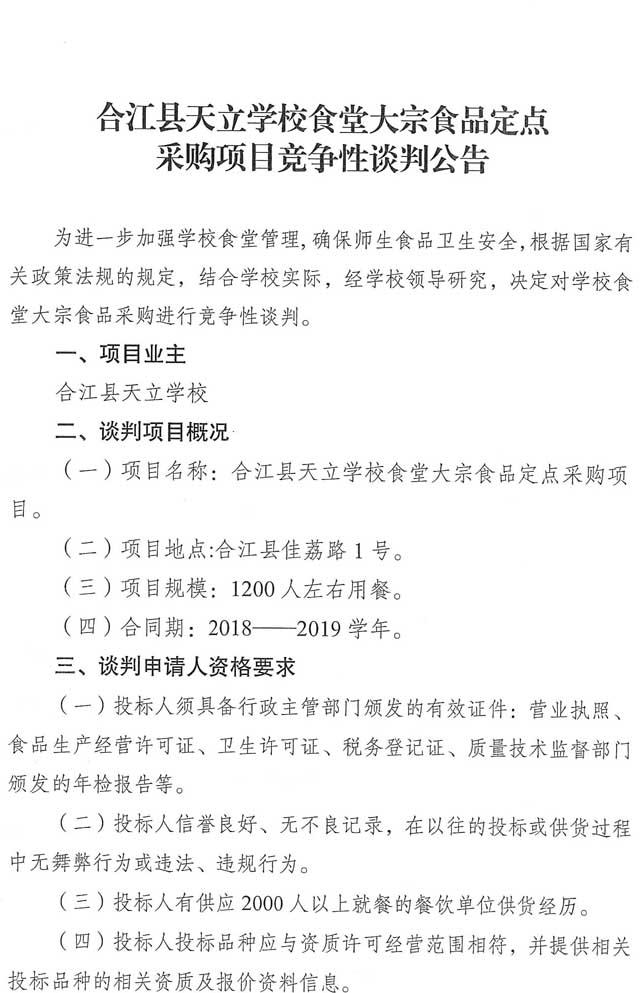 競爭性談判公告:合江縣天立學(xué)校食堂大宗食品定點(diǎn)采購項目競爭性談判公告