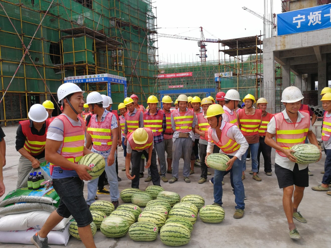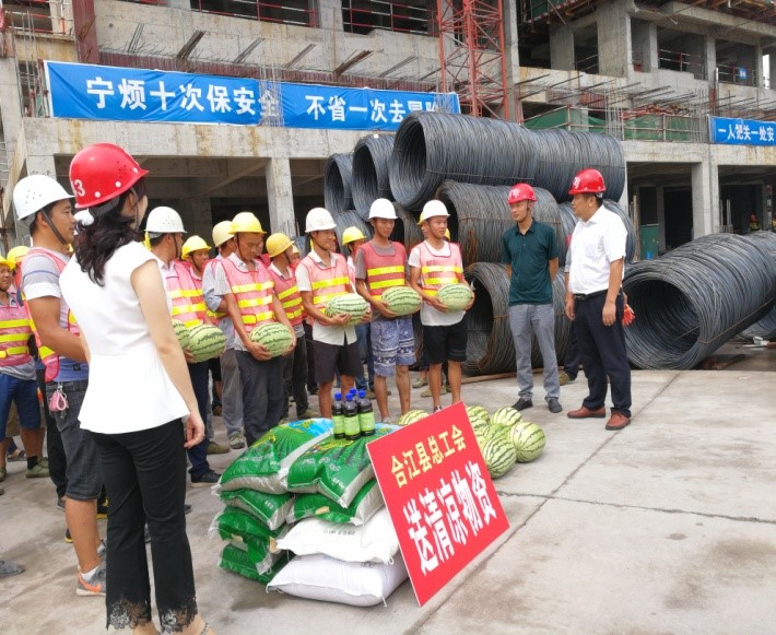 2019年8月5日下午,縣總工會(huì)會(huì)同城投公司、鑫晟公司、廣源達(dá)公司到鑫晟學(xué)府項(xiàng)目開展送“清涼”活動(dòng)??h工會(huì)領(lǐng)導(dǎo)一行對(duì)建筑工人表示慰問(wèn),并為他們送上藿香正氣液、風(fēng)油精、西瓜、綠豆、白糖等降暑防暑物品。
