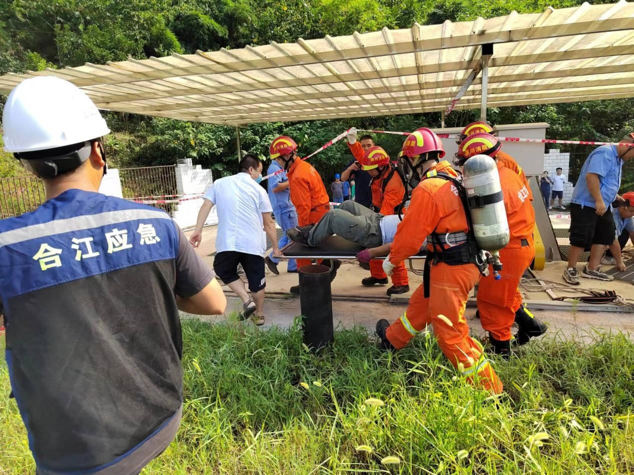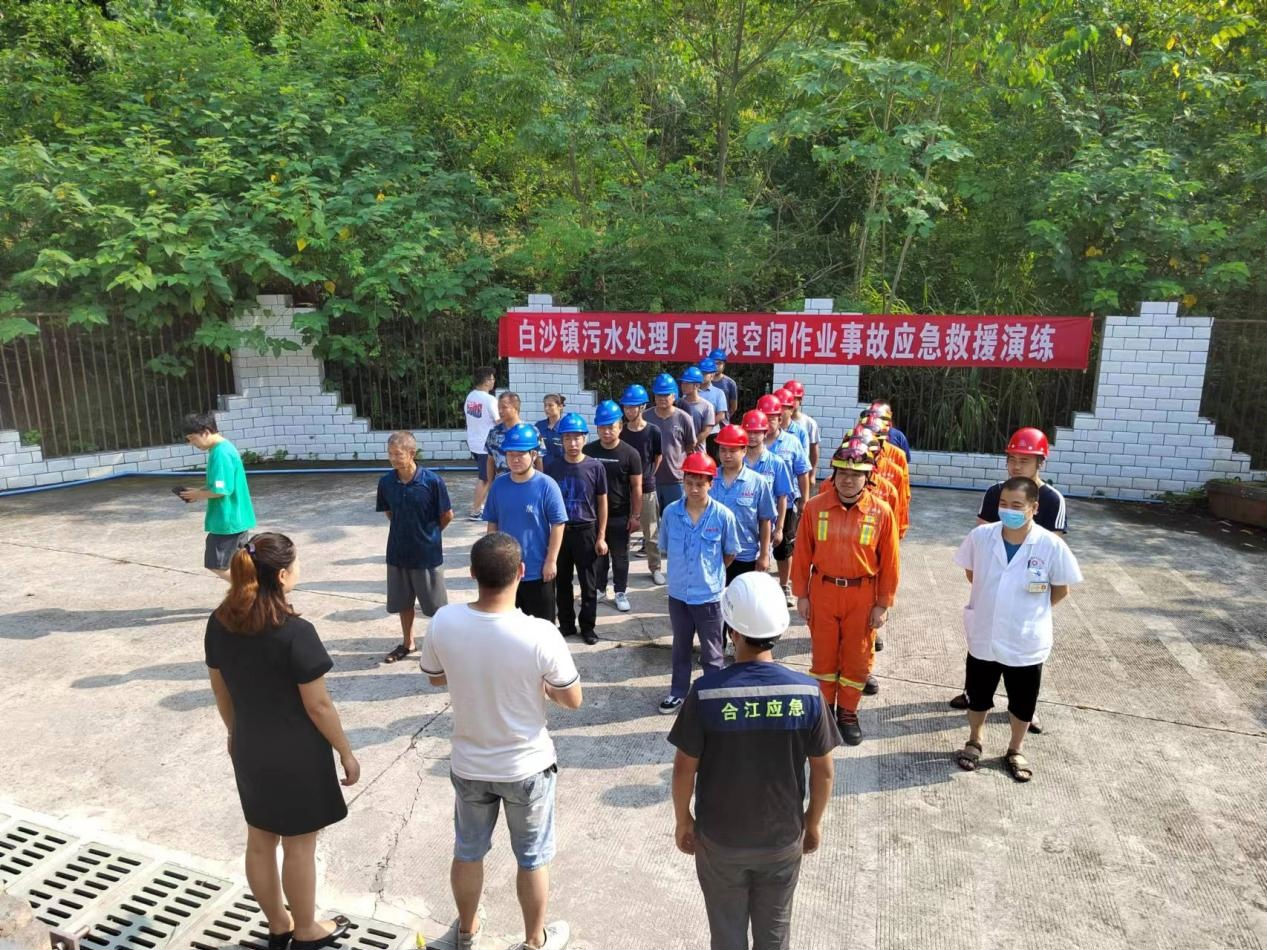 2022 年 8 月 5 日, 白沙鎮(zhèn)人民政府、 江北消防中隊(duì)、 白沙衛(wèi)生院和瀘州匯鑫環(huán)??萍加邢薰韭?lián)合在白沙鎮(zhèn)城市生活污水處理廠開(kāi)展有限空間作業(yè)應(yīng)急演練, 白沙鎮(zhèn)副鎮(zhèn)長(zhǎng)周雪蓮、 安辦主任牟葉奎、 江北消防中隊(duì)指導(dǎo)員王小峰、 匯 鑫公司副經(jīng)理劉可參加了本次演練。